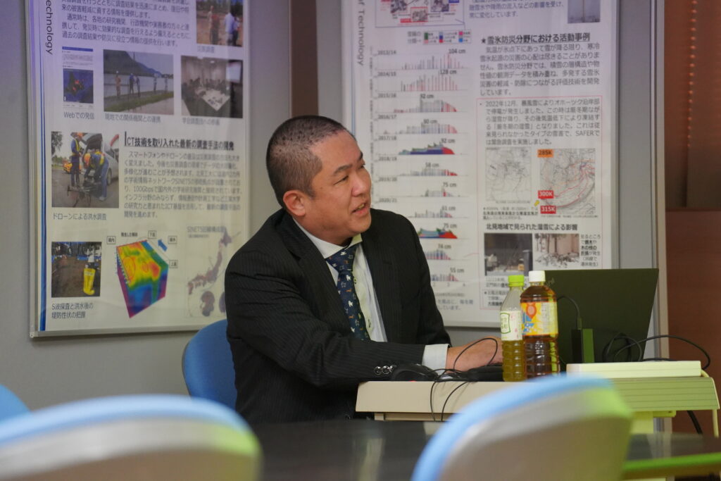 第2回防災懇話会では、標津町役場住民生活課危機管理室長であり、本学大学院社会人ドクターコース学生でもある和田直人氏を講師に迎え、「北海道標津町における暴風雪タイムライン策定の取り組み」をテーマに話題提供が行われました。自治体における実務の視点から、暴風雪時の対応計画策定の経緯や課題、関係機関との連携の重要性などが紹介され、研究と実務をつなぐ具体的な事例として参加者の関心を集めました。