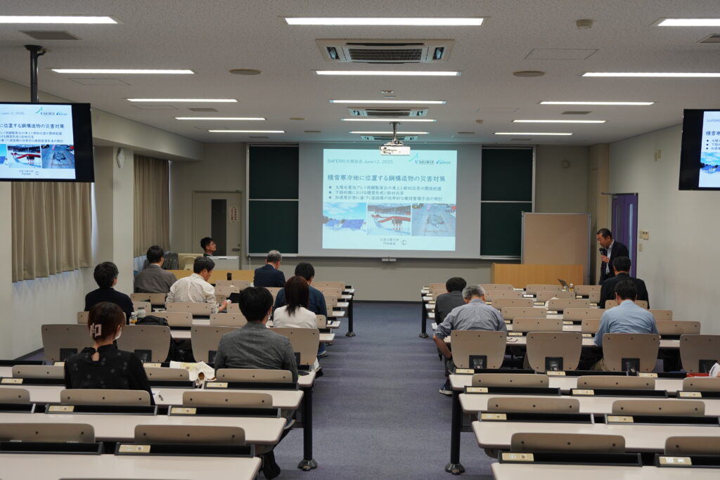 第1回防災懇話会は、SAFER年次総会に続いて開催されました。学内教職員および学生も参加し、分野を越えた意見交換の場となりました。講師は門田峰典助教で、「積雪寒冷地に位置する鋼構造物の災害対策」をテーマに講演が行われました。積雪寒冷地における構造物の維持管理や災害対策に関する研究動向が紹介され、インフラ分野と防災研究を結び付ける観点から活発な議論が行われました。